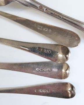 Ten various mainly Georgian hallmarked silver tablespoons including a bottom marked example, Exeter hallmarked examples and a further spoon marked sterling, weight 656g, a pair of possibly French 18thC white metal fiddle and thread pattern table spoon, weight 174g and two plated spoons