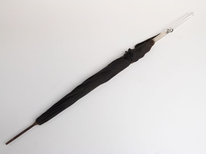 A 20thC Art Deco parasol with early perspex/celluloid or Lucite handle in the form of an obelisk, the ribs with brass finish, 87cm