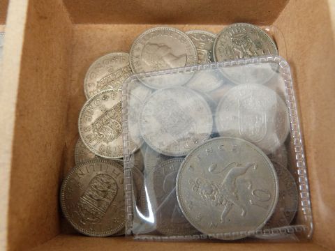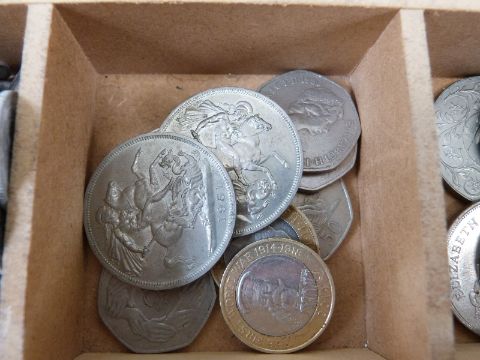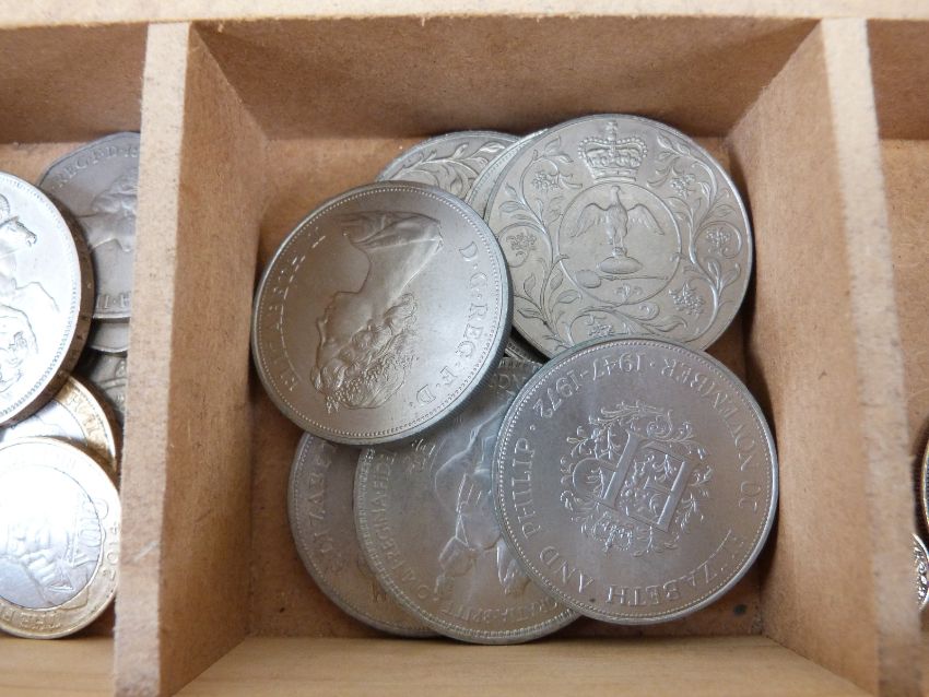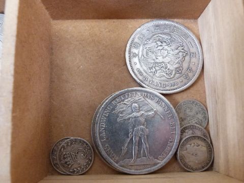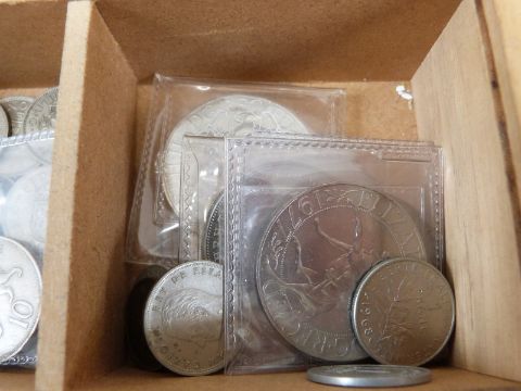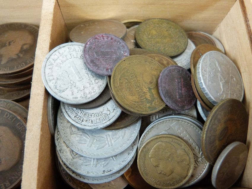 An amateur collection of UK and overseas coins to include silver content, white metal restrikes, 1950 VF penny, Heaton Mint, Nazi coin etc, all in wooden collector's tray