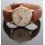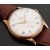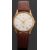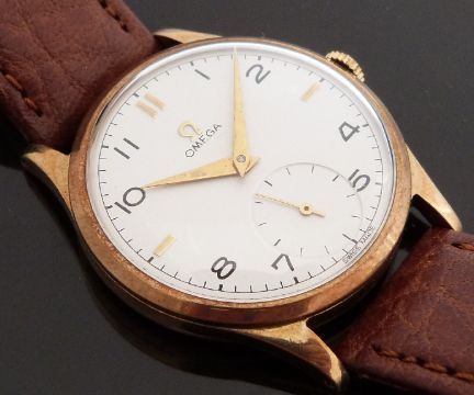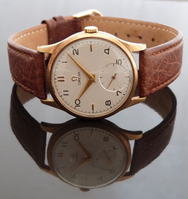 Omega 9ct gold gentleman's wristwatch ref. 13322 with with inset subsidiary seconds dial, gold hands, black Arabic numerals, gold baton markers at 3, 6, 9 and 12, champagne face and signed gilt 15 jewel calibre 265 movement, on brown leather strap, case diameter 33.5mm, serial number 12244572/ 415342