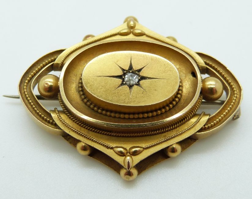 Victorian brooch set with a diamond to the centre with applied rope decoration and sphere design, verso a glass compartment, 8.1g, 4 x 3.3cm
