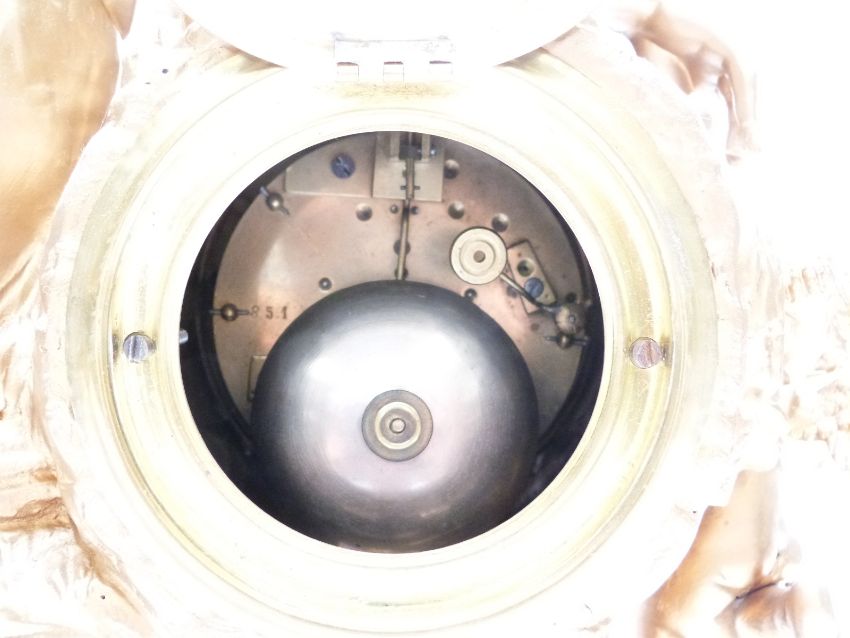 French 19thC gilt metal ormolu style figural mantel clock featuring a reclining lady with cherub and lovebirds, the white enamelled Roman dial with Breguet style hands, gilt ornate bezel surround, the two train movement no 351 by Japy Freres striking on a bell, signature to back of figure L Guillemin, 40cm tall