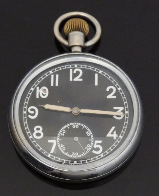 Military issue open faced keyless winding pocket watch with white Arabic numerals, black face, luminous hands and 15 jewel movement, marked to the case back 31515 below ministry broad arrow, case diameter 52mm.