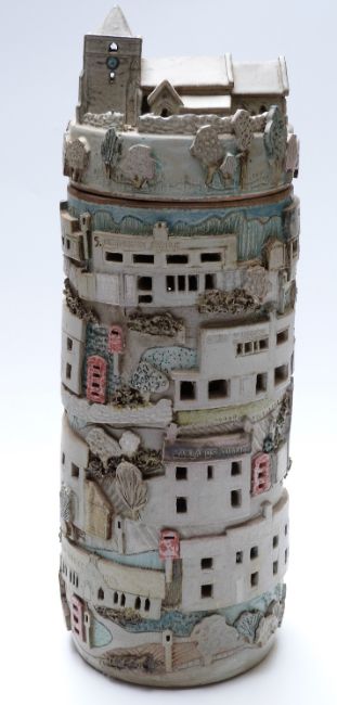 A large retro sectional pottery lamp in the form of a continuous landscape, 52cm tall