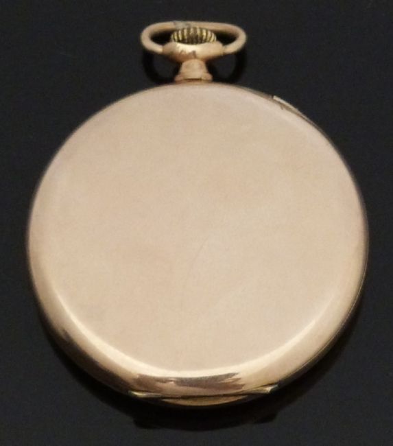 J W Benson of London 9ct gold open faced keyless winding slim cased pocket watch with Arabic numerals, inset subsidiary seconds dial, gilt minute markers, blued Breguet hands and 15 jewel movement, case diameter 45.7mm, 54.2g.