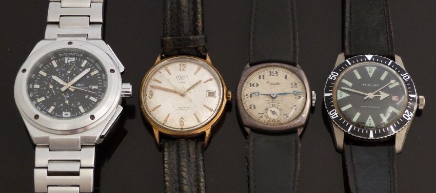 Four gentleman's wristwatches comprising a Stirling diver's style watch with luminous hands and markers, date aperture and black face, case diameter 36mm, Avia automatic with date aperture, gold hands and Arabic numerals and silver face, case diameter 35mm,, Everite hallmarked silver military style cushion shaped watch, case diameter 30mm and one other together with two military NATO style canvas watch straps.