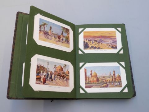 Edwardian postcard album with cards relating to Egypt / Cairo, Constantinople, Leamington, romantic, stars of stage and screen, cards with real hair, Victorian sentimentalism etc