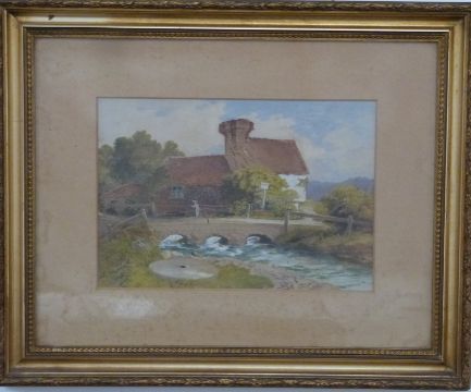 S E Slader watercolour cottage and bridge 22 x 32cm together with a further watercolour, indistinctly signed possibly Hugh Ridley, titled On the Puddle and dated 1915, 28 x 46cm