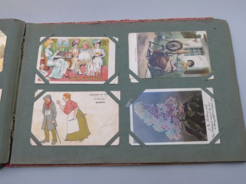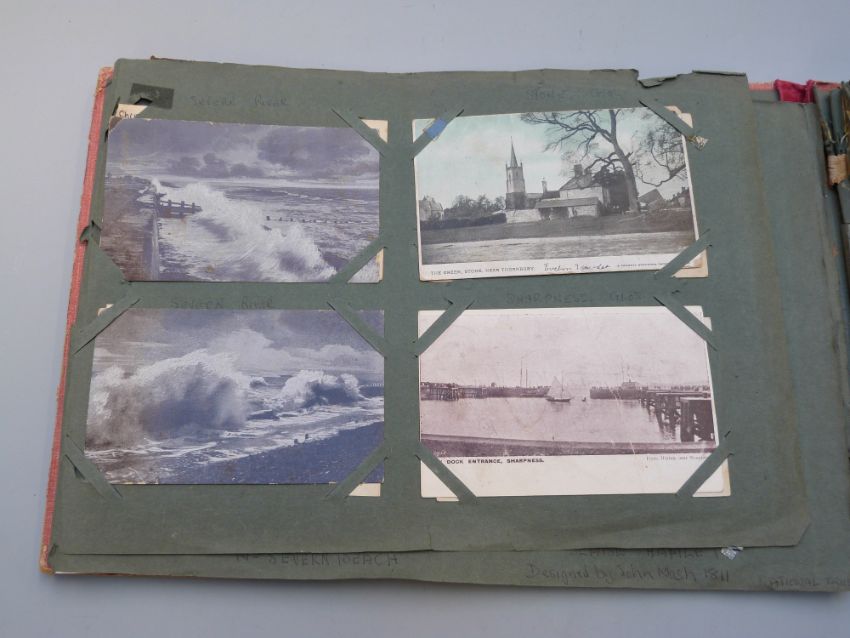 An Edwardian postcard album with cards including local Gloucestershire / Bristol, shipping, WWI,Thornbury, Sharpness Docks, River Severn, New Passage Hotel, Salutation Hotel, Pilning, Bristol city, docks and river Avon, Avonmouth and docks, Clifton and Rocks Railway, Weston Super Mare, Limpsfield, Surrey, Fish Market Yarmouth, Penzance, River Thames barges, Henley Regatta, Bath, Cardiff streets, Nant Gwyn Colliery pay day, HMS Majestic, WWI silk card, romantic Thornbury card, risque shocking 'call and see the other', romantic and humorous etc, approximately 220 cards