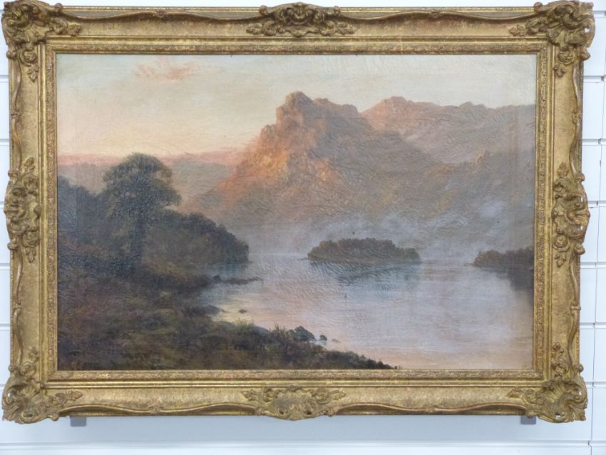 F E Jameson oil on canvas Ellen's Isle Loch Katrine, signed lower left W Richards (one of Jameson's pseudonyms) and titled verso, 50 x 75cm, in gilt frame
