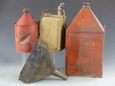 Royal Daylight oil can, Valor can, funnel and a pyramid top vintage oil can