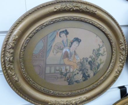 Quantity of 19thC and later paintings and framed prints including a portrait of a gentleman in oval gilt frame, circular still life of flowers on a board, signed limited edition 1 / 150 print by Andrew Price, and an Eastern scene of two ladies together with a framed Art Nouveau style bronzed plaque of a lady