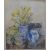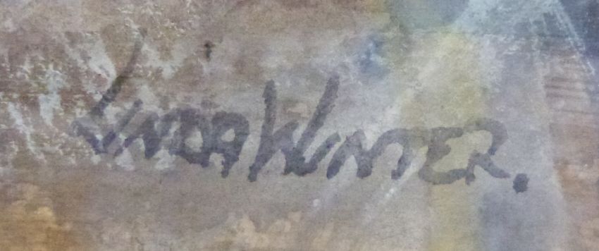 Linda Winter watercolour cat with jug, daffodils and teaset, signed lower right, 61x48cm