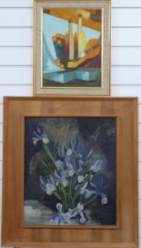 Sandler acrylic on board still life and a further still life of irises, signed and dated Schiele 61 lower right, 55 x 47cm