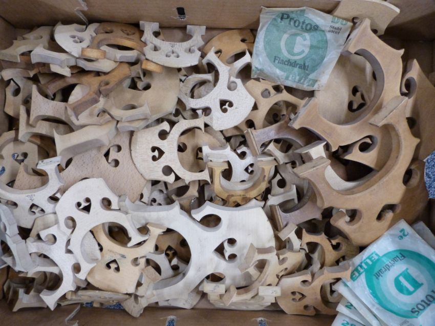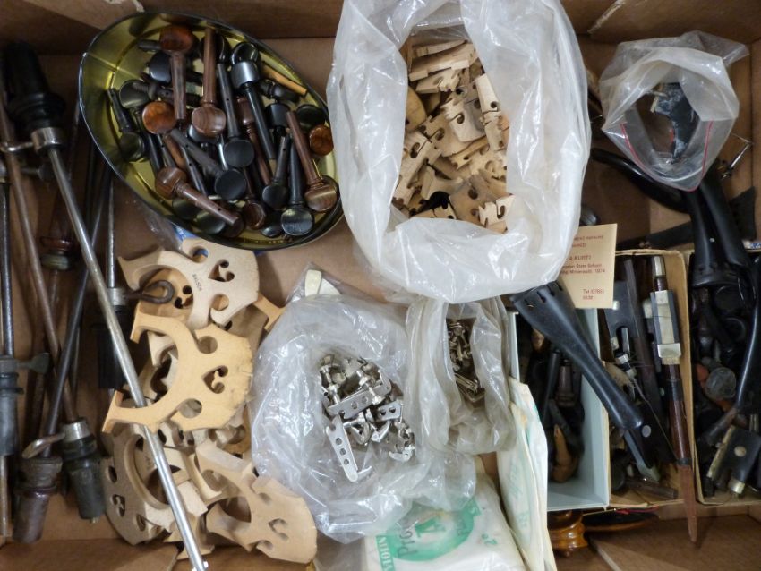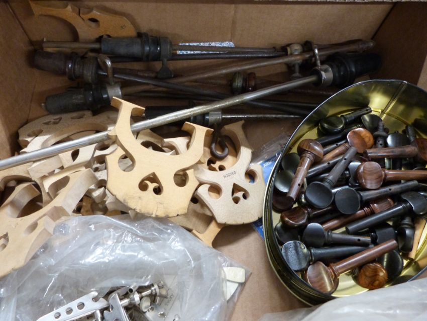 A large collection of violin and cello fittings etc including an extensive selection of bridges covering many sizes