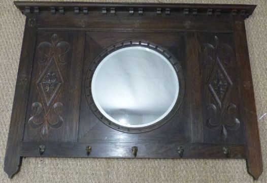 Oak wall mounted coat rack with bevelled circular mirror, width 118cm
