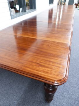 Exceptionally large Maple & Co Ltd mahogany campaign dining or boardroom table, with screw in reeded legs with brass and ceramic castors, quadruple wind out mechanisms, 14 additional leaves and broad arrow ministry marks to underside of frame, W153 x H75cm x maximum length 816cm