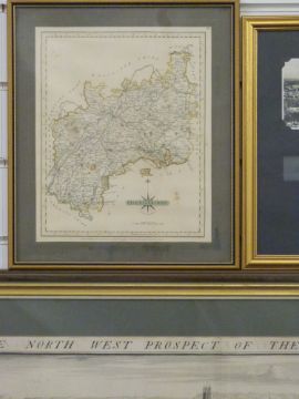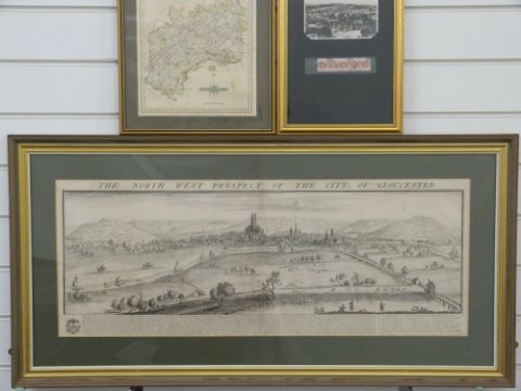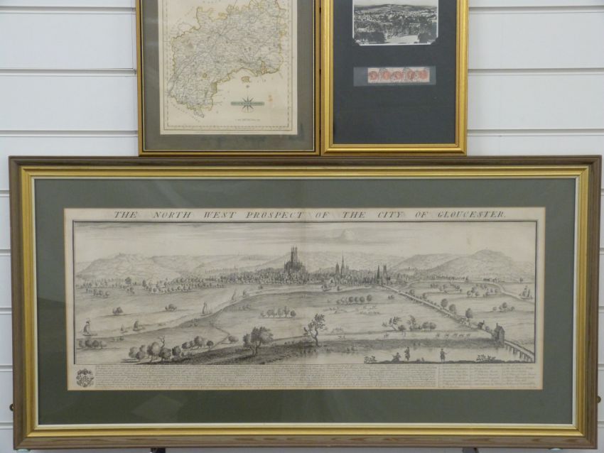 18thC etching 'The North West Prospect of the City of Gloucester', 30cm x 80cm, 18thC map of Gloucestershire and a framed display including a block of stamps with late Victorian Stroud postmarks