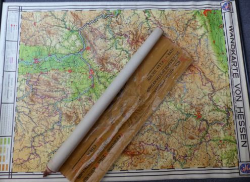 German Wandkarte Von Hessen large scale linen backed education scroll map and a similar copy of a 15thC atlas / map of the world