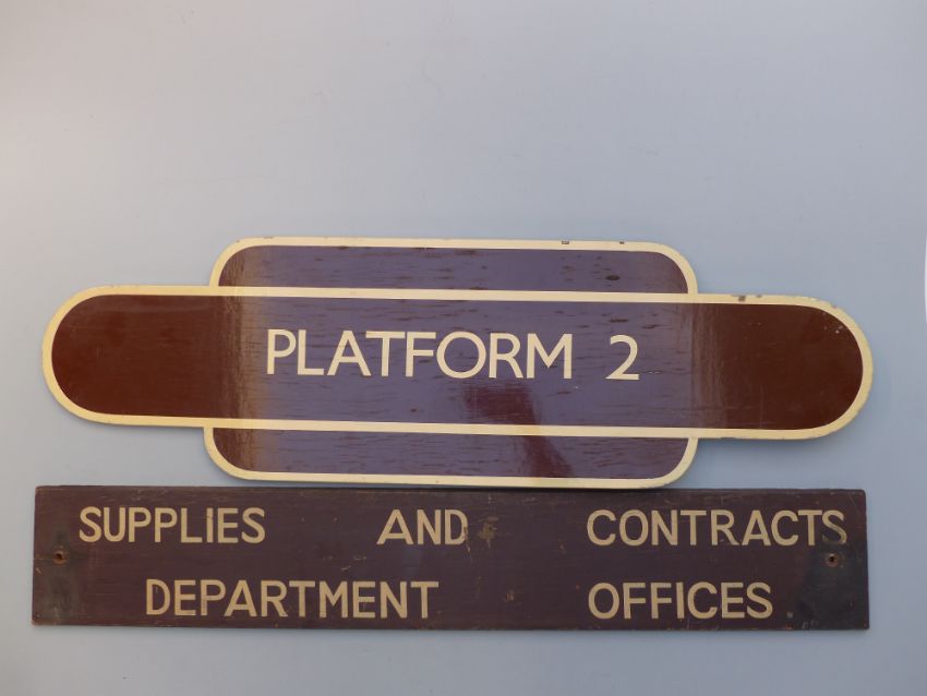 Two wooden railway signs, one Platform 2 the other Supplies and Contracts Department Offices, both in GWR colours