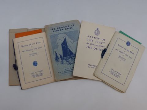 [Naval] Programmes for the Review of the Fleet by His Majesty The King at Spithead, 1935, 1937 and 1953 each with folding map, together with admittance tickets to SS Sandown, SS Queen of Thanet and the SS Southsea with copy of The Romance of London River by A.G. Thompson illustrated by Helen McKie 1935 and an album of photographs which appear to be taken at the fleet review
