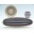 Three pieces of Poole Pottery comprising a vase in purple Portuguese Stripe, 1922-1924, 8cm tall, plate with geometric pattern, and a cucumber dish 1950s