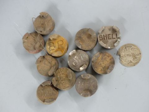 Quantity vintage petrol can caps including Taxibus, BP, MEX, Shell etc