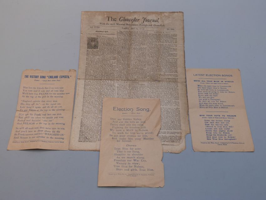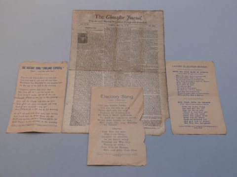 Three 19thC Stroud interest flyers including election song, victory song etc, each printed by John White Stroud, together with the Gloucester Journal April 24 1739