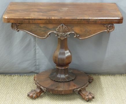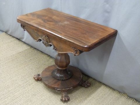 Victorian rosewood fold over card table with bulbous octagonal support and circular base, raised on four lion's paw feet, W91 x D46 x H72cm