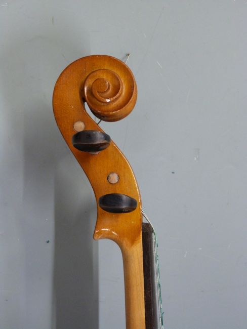 Cased viola, probably German or Eastern European, with 40.5cm two piece back, bow, shoulder rest, practice mutes etc