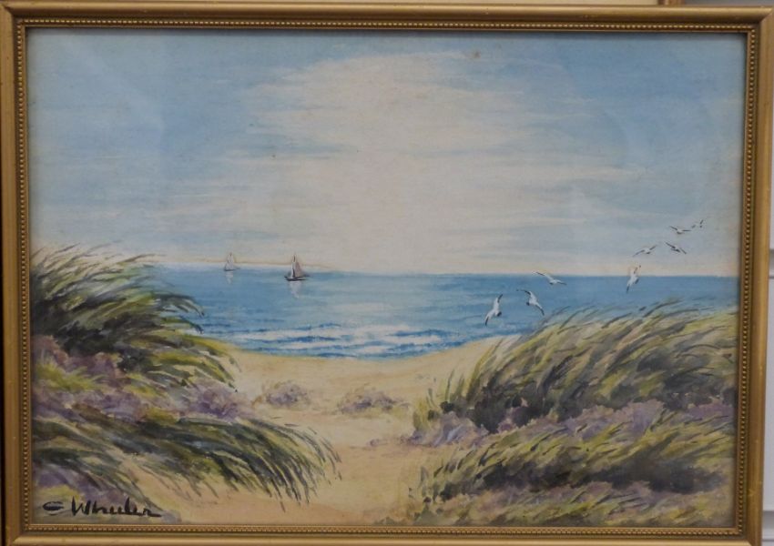 W Scarlett-Hatton watercolour lake scene with boats, signed lower left, 19 x 26cm, further coastal seascape signed S Wheeler and two further watercolours
