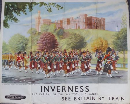 British Railways poster Scottish Region B24436 'See Britain by Train' Inverness, depicting the Queen's Own Cameron Highlanders marching along Ness walk and Inverness castle, by Lance Cartermole, 100 x 123cm