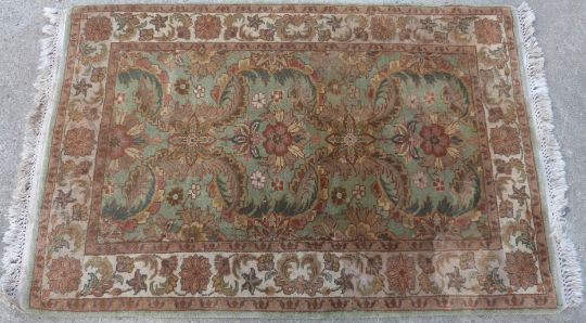 Chinese style rug with geometric decoration on cream ground together with a florally decorated rug on a green ground.