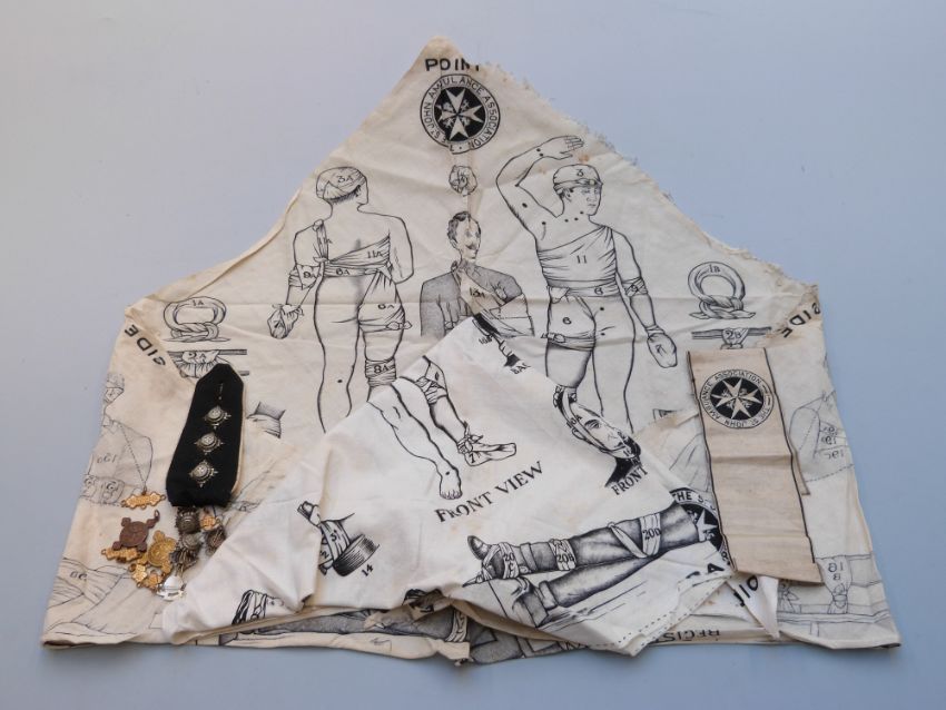Two St John Ambulance training slings, silk armband, St John Ambulance Brigade pips and a quantity of further insignia