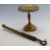 An Arts and Crafts brass pierced trivet / tazza with partial registration number, 24cm tall and a vintage metal clip with handle, possibly for handling a bull with nose ring
