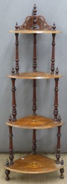 Victorian walnut inlaid four-tier corner whatnot, height 150cm