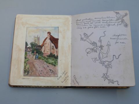 Edwardian autograph and sketch book including Nell Payne Jewellers window drawing, Doris Bean figures in a winter scene etc