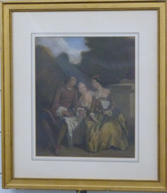 A pair of oil on board figures in a garden, one with woman playing a lute, each 28 x 23cm