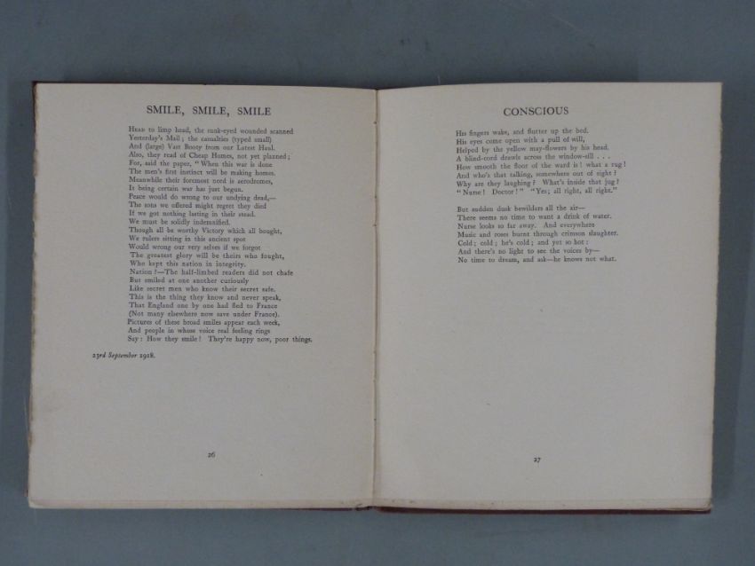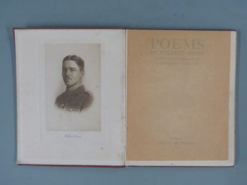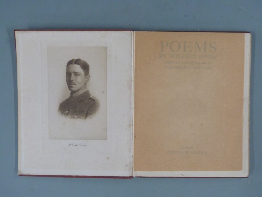 Wilfred Owen Poems with An Introduction by Siegfried Sassoon published in London by Chatto & Windus 1920 first edition with a frontispiece portrait in original cloth with printed spine label. Collection of Anti-War Poems published after the poet was killed during enemy action in 1918