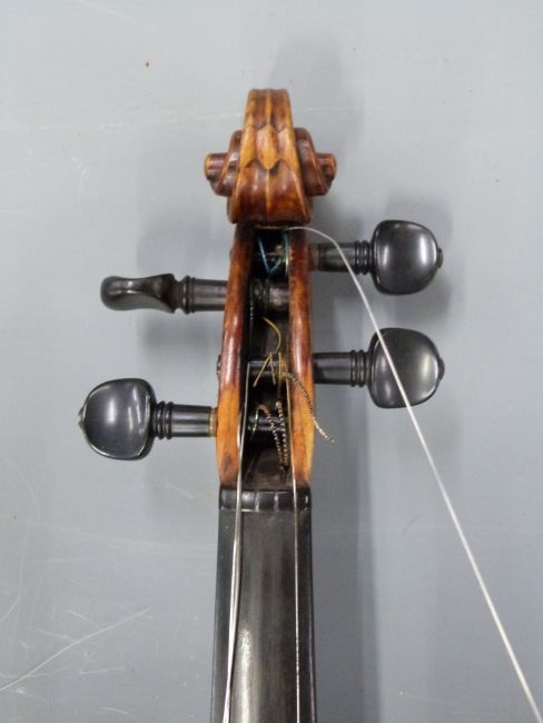Late 19thC full size violin labelled Nicolaus Amatus with 36cm two piece flame back, grafted neck, inlaid purfling, two bows and Molda, Hawkes & Son carry case