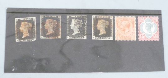 Four Victorian penny black stamps, one with four margins, Victoria 4 1/2d and a George V 1d