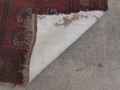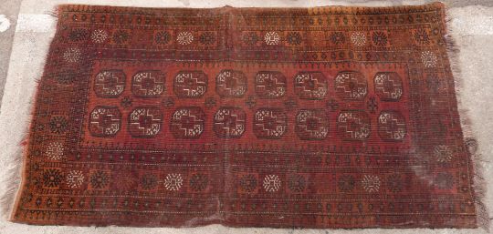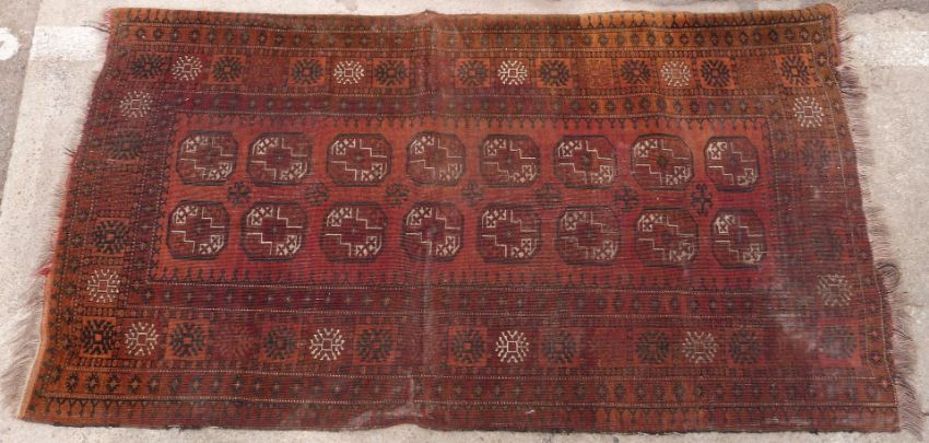 Turkoman Bokhara rug with sixteen octagonal guls surrounded by geometric borders, on burnt orange ground, 210 x 118cm