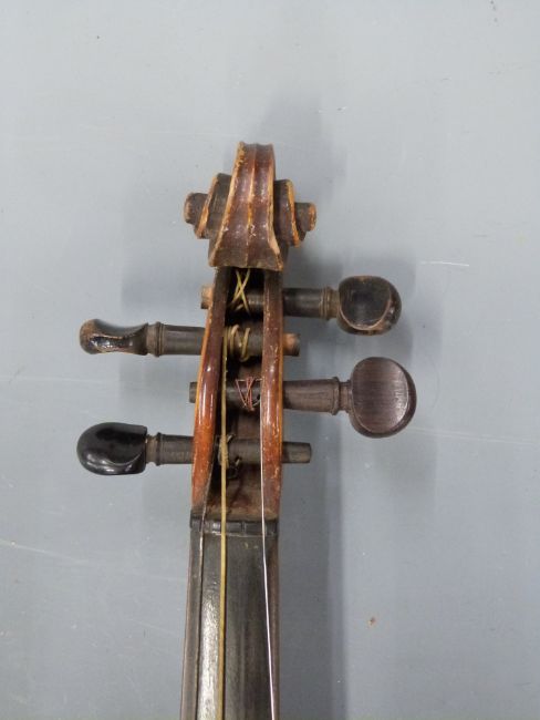 A late 19th / early 20thC anonymous full size violin with 36cm two piece flame back and mother of pearl inlaid bow, in hard case