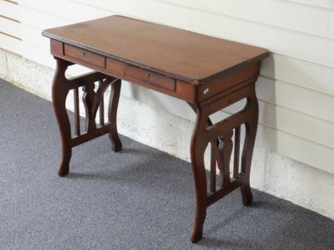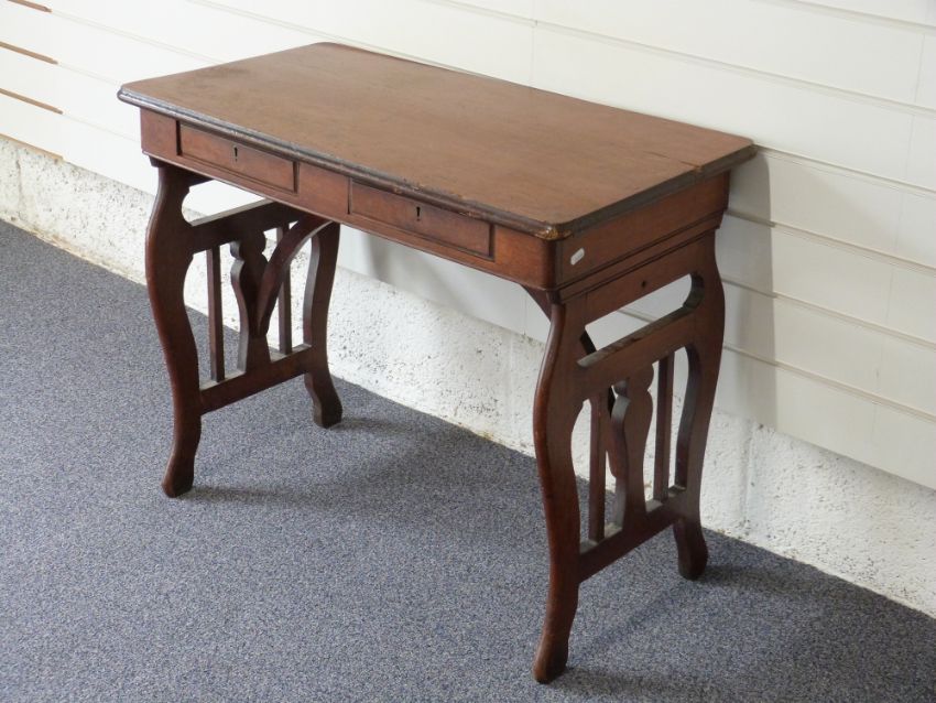 19thC mahogany two drawer campaign table with folding legs and detachable stretcher, W82 x D44 x H66cm
