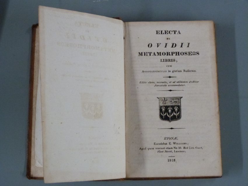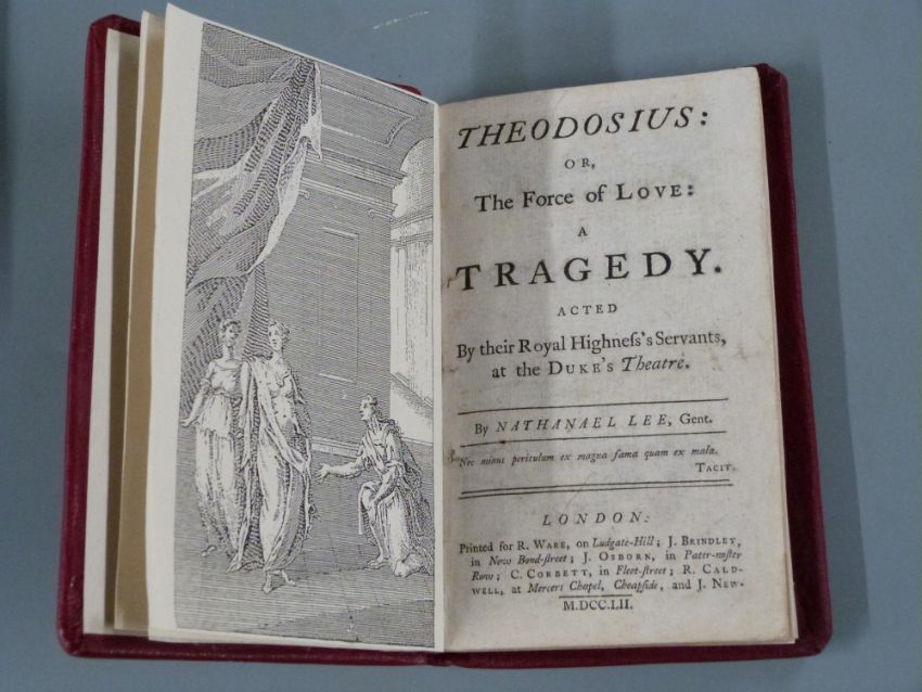 [Antiquarian] Theodosius or The Force of Love: A Tragedy Acted by their Royal Highness's Servants at the Duke's Theatre by Nathaniel Lee London 1752 with engraved plate in full leather, Electa Ex Ovidio Metamorphose's Libris 1818 full calf, Ruskin in suede binding, Goldsmith, Pope and Browning (5)
