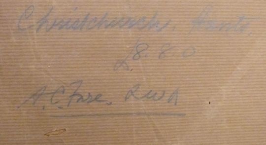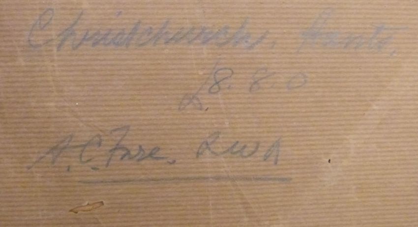A. C. Fare RWA watercolour Christchurch, Dorset 28 x 37cm, Bristol Savages label verso
