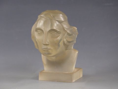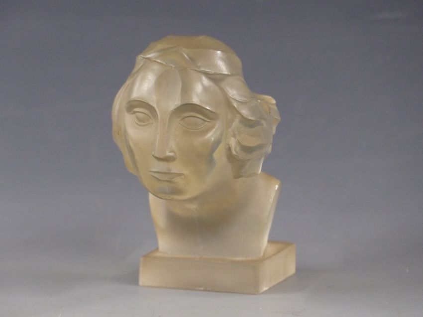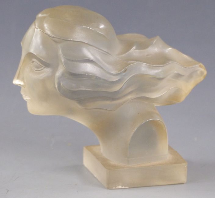 Circa 1930s Art Deco Lalique style glass car bonnet mascot in the form of a lady's head with flowing hair, height 11cm