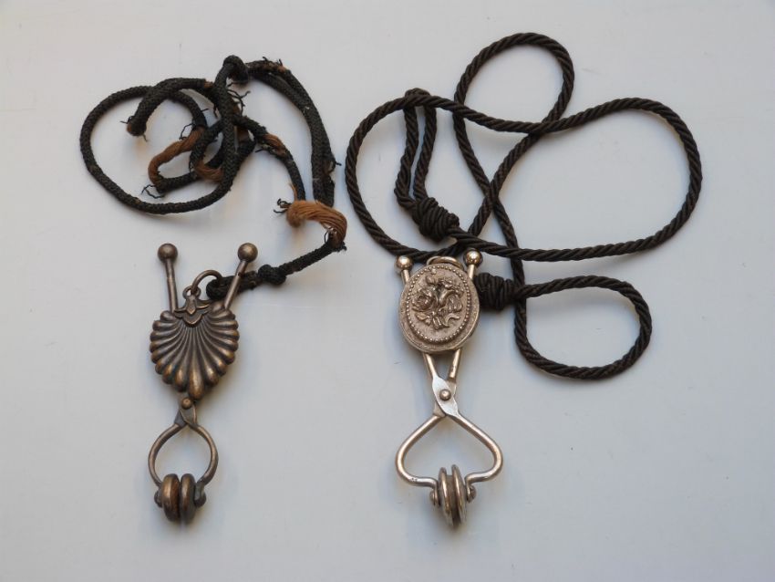 Two Victorian skirt lifters with cord, one inscribed patent registered September 21 1876