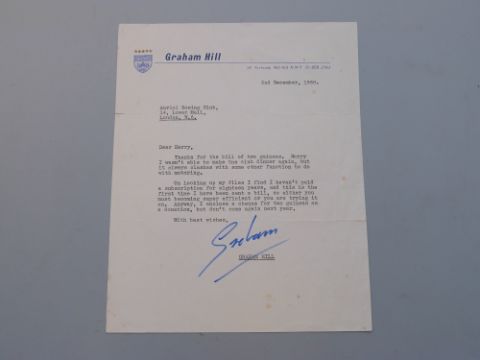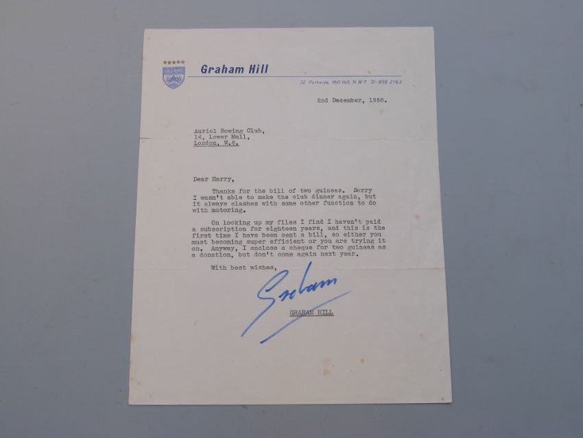 Graham Hill signed letter dated 1968 relating to Auriol Rowing Club