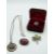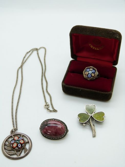 A silver pendant set with a millefiori cabochon by Caithness, a similar ring, a silver clover brooch set with serpentine and a brooch set with rhodonite